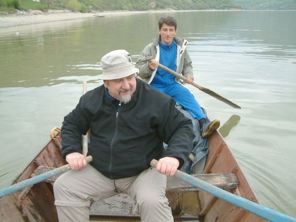 Није поза него потреба да се помогне мотору који често трокира! Ускладиштени вишак енергије добро дође у оваквим тренуцима. На слици директор Музеја, П. Дурлић весла, а кустос Б. Крчмаревић усмерава чамац у жељеном правцу. Снимио М. Балабановић.