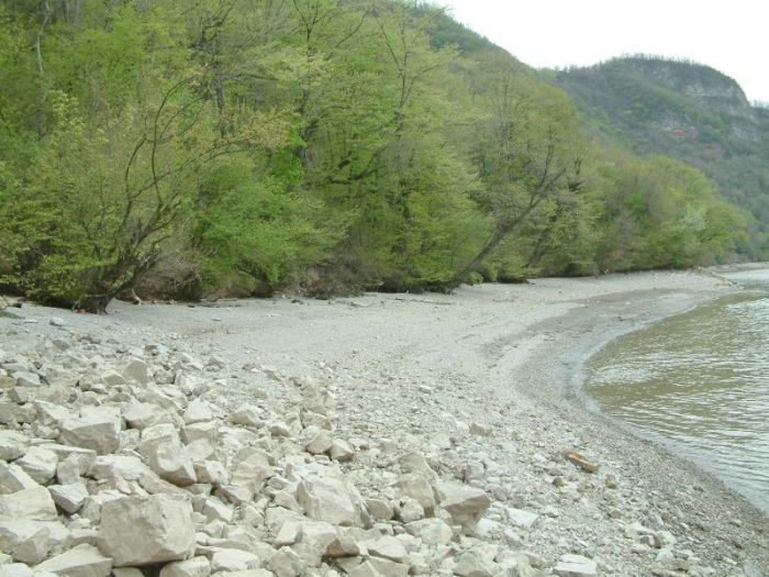Тераса Власца, поглед узводно. Од стајног места фотографа, до малог пешчаног рта који залази у Дунав има око 130 метара. Снимио Б. Крчмаревић.